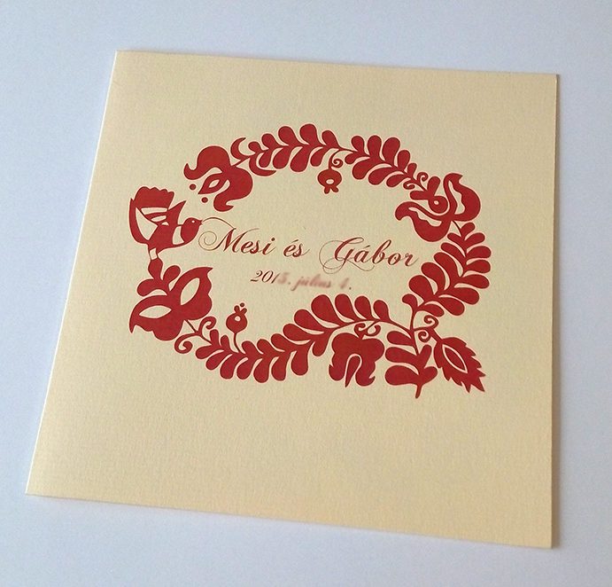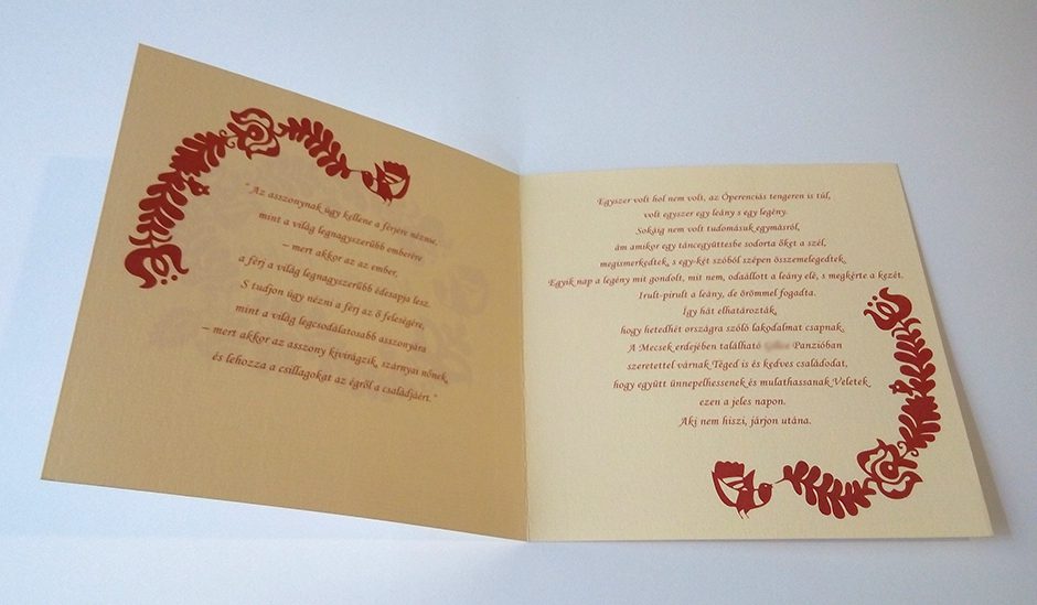 Esküvői meghívó magyar népmesék mintával. Színesen nyomtatott, halványsárga kreatív papíron. Mérete: Összehajtva: kb. 15×15 cm Kinyitva: kb. 15×30 cm Ára: ...