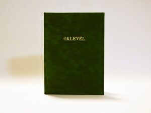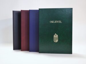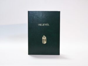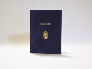 A/4 méretű oklevéltartó fekete színű kötészeti műbőr anyagból. Elején arany színű oklevél felirattal.