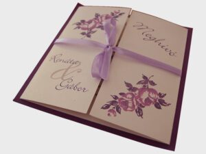 Egy lapos, kétoldalasan nyomtatott esküvői meghívó. Színesen nyomtatott, tűprégelt kreatív papíron. Mérete: kb. 105×148 mm Ára: 250 Ft/db; 3750 Ft/15 db